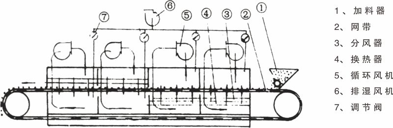 工作原理如圖所示,料斗中的物料由加料器均勻地鋪在網(wǎng)帶上,網(wǎng)帶采用12-60目不銹鋼絲綱,由傳動裝置拖動在干燥機內(nèi)移動,干燥機由若干單元組成,每一個單元熱風(fēng)獨立循環(huán),其中部分尾氣由專門排濕風(fēng)機6排出,第一單元排出廢氣量均有調(diào)節(jié)閥7控制。在上循環(huán)單元中,循環(huán)風(fēng)機5出來的風(fēng)由側(cè)面風(fēng)道進入單元下腔,氣流向上通過換熱器4加熱,并經(jīng)分配器6分配后,成噴射流吹向綱帶,穿過物料后進入上腔。干燥過程是熱氣流穿過物料層,完成熱量與質(zhì)量的過程。上腔由風(fēng)管與風(fēng)機入口相連,大部分氣體循環(huán),一部分先進入上腔,向下經(jīng)換熱器加熱,穿過物料層進入下腔,下腔由側(cè)面風(fēng)道及回負管與風(fēng)機入口相連,大部分氣體循環(huán),一部分排出。下循環(huán)單元根據(jù)用戶需要可靈活配備,單元數(shù)量亦可根據(jù)需要選取。
